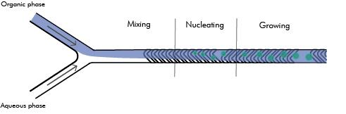 3. 自组装成粒:混合后有机相溶剂(乙醇)快速扩散至水相,脂质分子因溶解度骤降而核化(Nucleating),并逐步生长(Growing)为稳定的 LNPs,最终从出口收集。