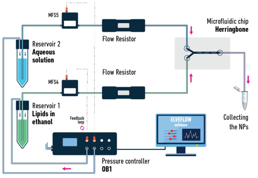 1. 流体驱动:通过压力驱动泵(如 ELVEFLOW OB1 流量控制器)提供无脉动流,确保有机相(脂质乙醇溶液)与水相(缓冲液)以稳定流速进入芯片入口
