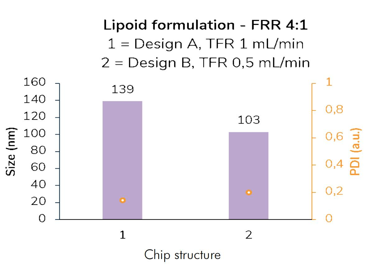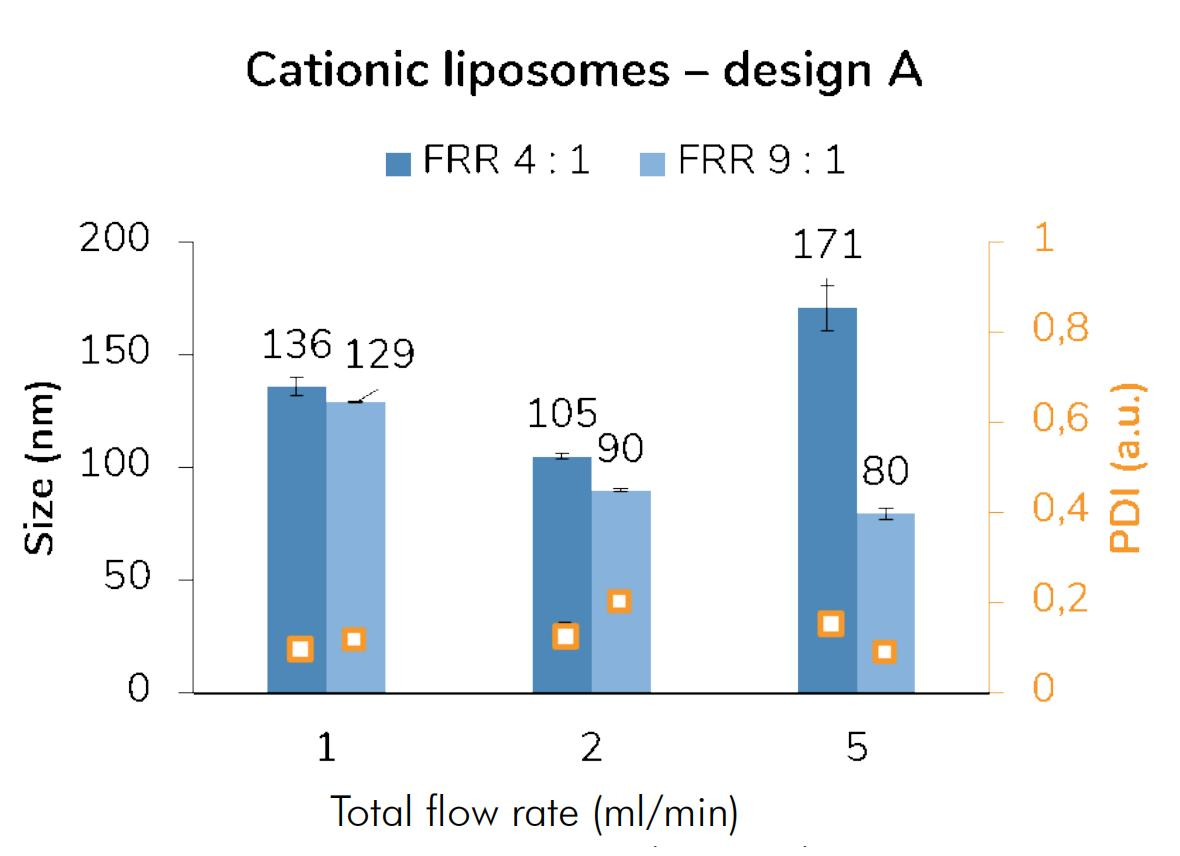 /流量比(FRR,水相 / 有机相):FRR 越高,水相对有机相的稀释速率越快,脂质核化尺寸越小,如 FRR=10:1 时粒径比 FRR=2:1 小 30%~40%;