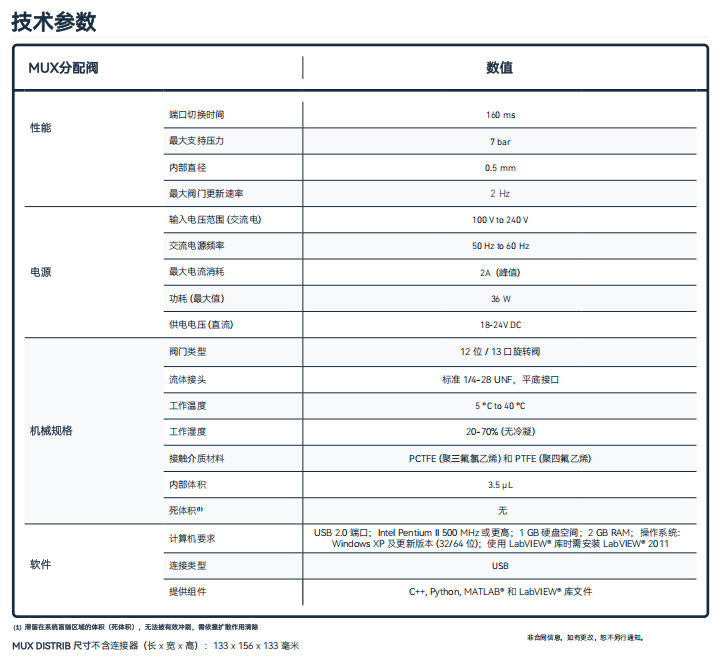 使用 MUX 分配阀可将多达 12 种不同溶液依次注入一条微流控管线,用于样品采集或平行实验。