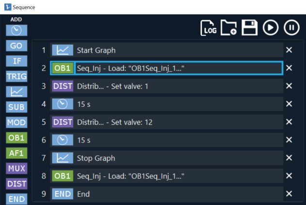 - 添加步骤:① OB1 加载配置(如 “Flow_200μL”)→② MUX 选择端口(如 “Solution 1”)→③ “Wait” 设置注射时间(如 30s)→④ 重复②-③切换其他溶液→⑤ OB1 加载 “0 配置”→⑥ “END”(结束序列)