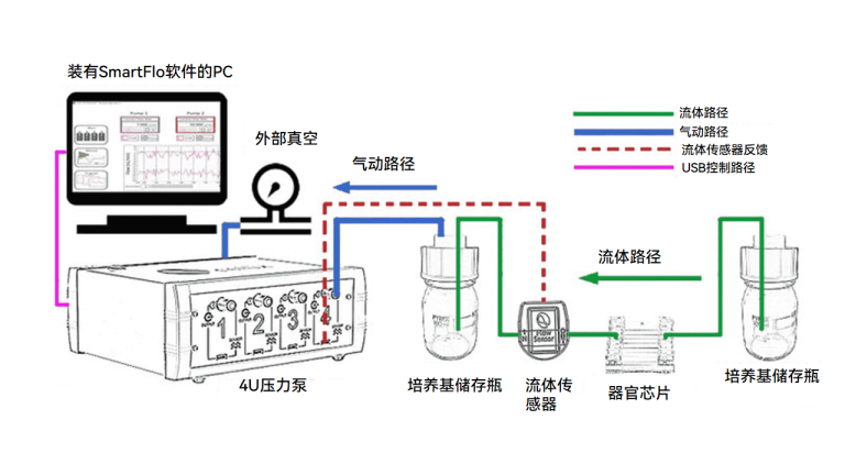装有SmartFlo软件的PC通过USB连接到4U泵,泵管路套件与培养基储存瓶和流量传感器相连,芯片与两个培养基瓶相连以便培养液从芯片上流过,流量传感器和泵的连接以即时反馈流量。